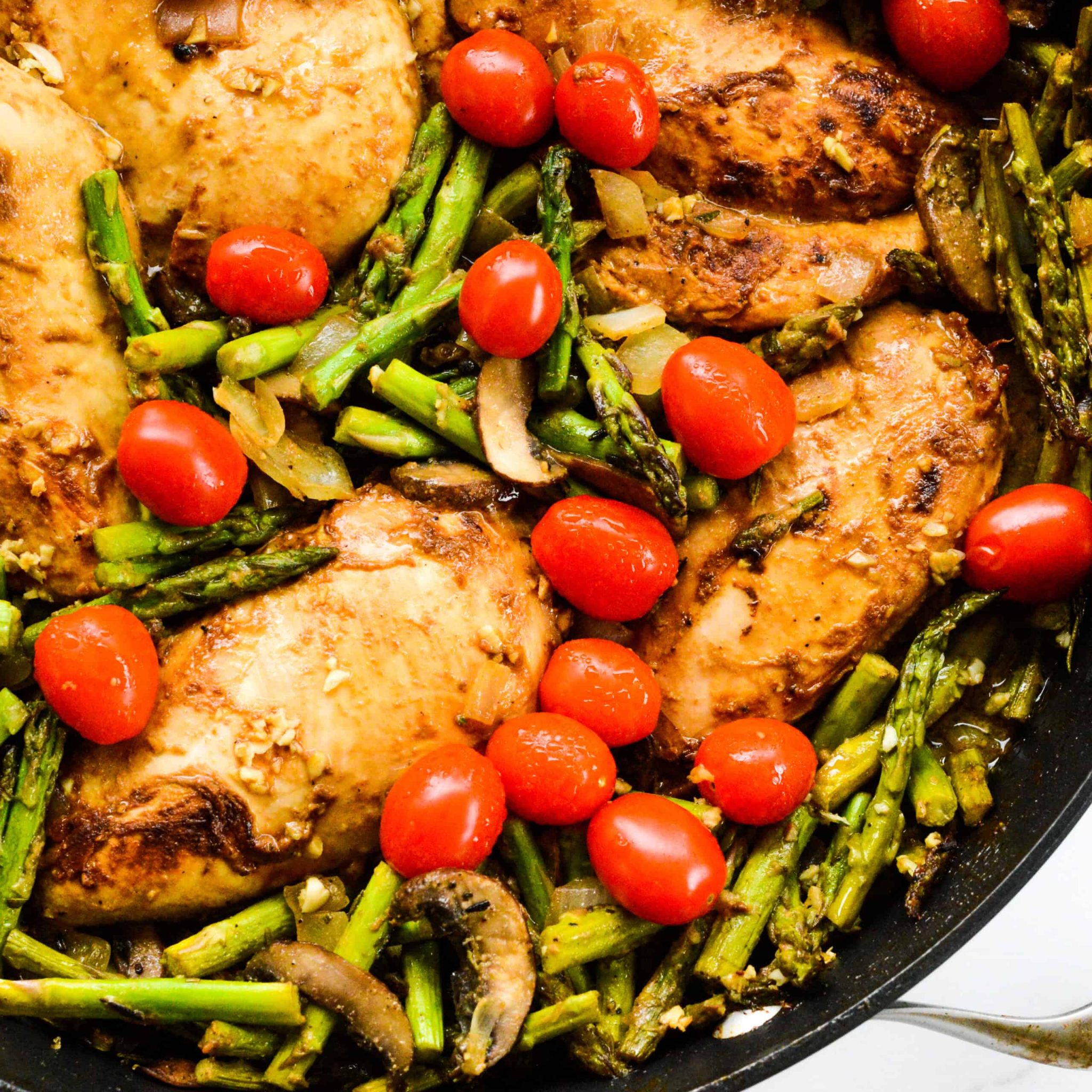 Ingredients: Chicken, Asparagus, Cremini Mushroom, Cherry Tomatoes, Onion, Garlic, Dijon Mustard, Aged Balsamic Vinegar, Fresh Herbs, Italian Extra Virgin Olive Oil, Spices & Sea Salt